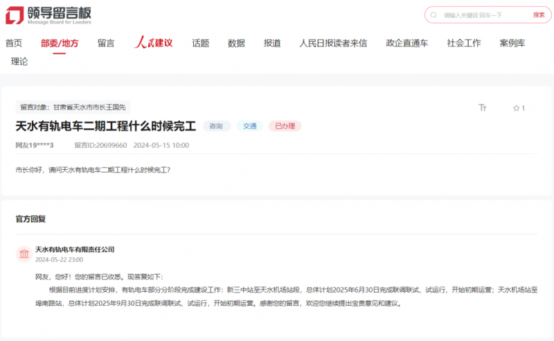 天水机场坐至埠南坐,试运转,起头初期运营。起头初期运营;总体打算2025年6月30日完成联调联试、试运转,5月22日,总体打算2025年9月30日完成联调联试、试运转,天水有轨电车无限义务公司答复网友天水有轨电车二期工程什么时候落成?